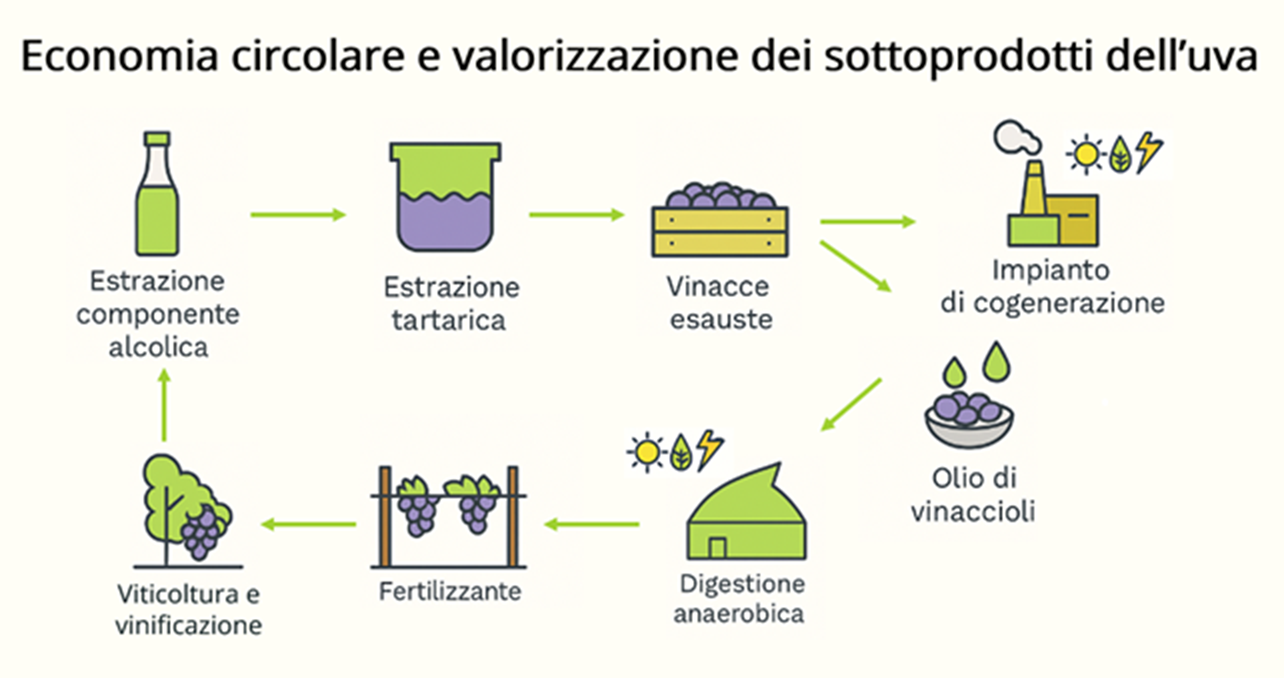 Da questi materiali, attraverso processi naturali, si ottengono acido tartarico e alcool etilico, contribuendo alla riduzione degli sprechi nella filiera agroindustriale. Inoltre, gli scarti residui vengono trasformati in energia tramite impianti di biodigestione e cogenerazione a biomassa. Il materiale digerito finale viene riutilizzato come fertilizzante in agricoltura.