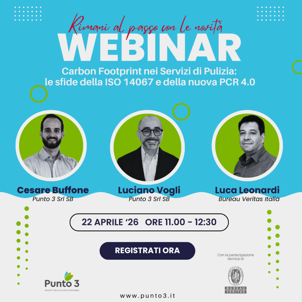 Per fare chiarezza sul panorama normativo, Punto 3 organizza un webinar di approfondimento dedicato alla Carbon Footprint di Prodotto (CFP) secondo lo standard ISO 14067, analizzando nel dettaglio le novità introdotte dalla nuova PCR 4.0 (Product Category Rules) specifica per i servizi di pulizia professionali.